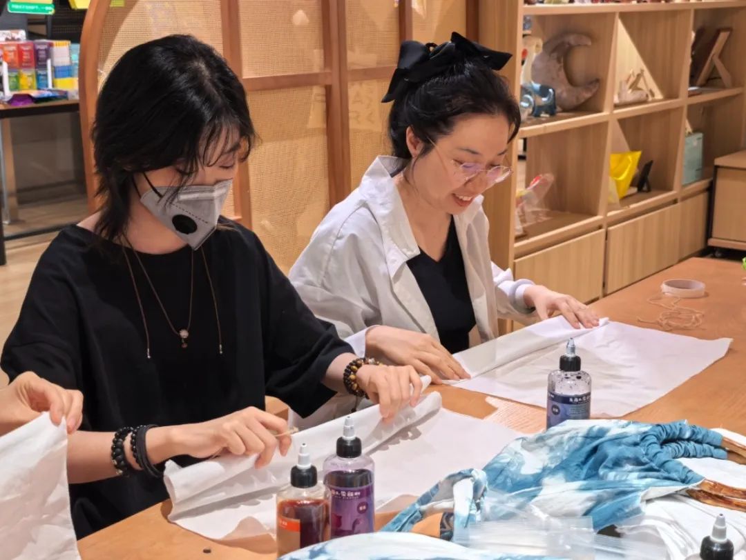 新汇文·文化创意体验中心开展“布上生花 非遗扎染”主题活动。读者们手持皮筋、木夹与素白棉布,在工作人员指导下开启了一场现代扎染实验,用化学颜料碰撞出东方美学的随性诗意。