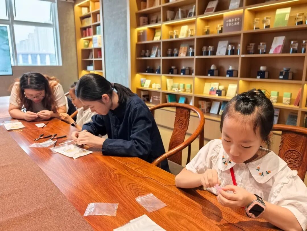 新汇文·文化创意体验中心开展“一簪一念匠心之旅”主题活动。案上珠玉丝线静陈,读者们指尖轻绕,将东方雅致细细缀入细节。从斟酌材料到专注穿缀,零散部件渐成鬓边风物,重现“云鬓斜簪”的古意诗情。这不仅是一次手作体验,更是一场与东方美学的温柔相逢。