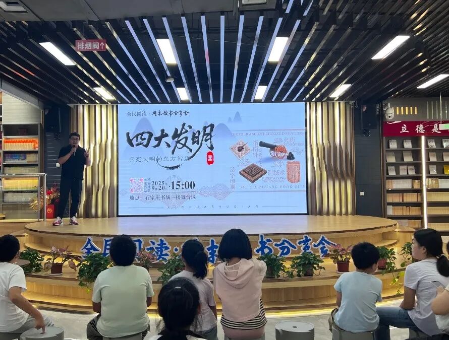石家庄书城开展“四大发明:点亮文明的东方智慧”主题活动。主持人生动讲解,从指南针、造纸术、火药到活字印刷,清晰展现了四大发明的起源、发展及世界影响。活动还设有古法造纸、指南针组装、活字印刷等体验环节,让读者在动手实践中感受中华传统文化的魅力。