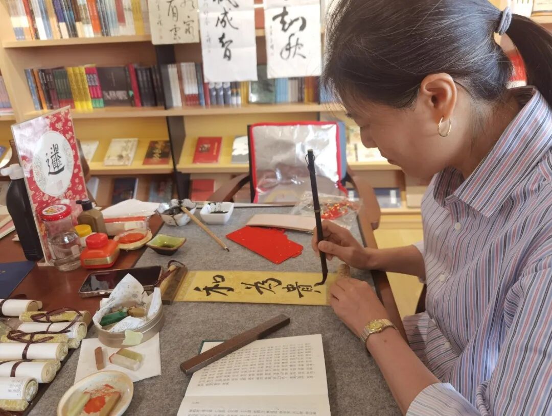 新汇文·文化创意体验中心开展“匠心手作墨韵雅集”主题活动。梁玉瑾老师现场挥毫,在书签与扇面上留下或遒劲或清雅的墨迹。大家围拢欣赏,或观摩笔法,或等待定制,现场气氛温馨热烈。梁老师以书法为媒,将传统文化的温度与美感传递给每位读者。
