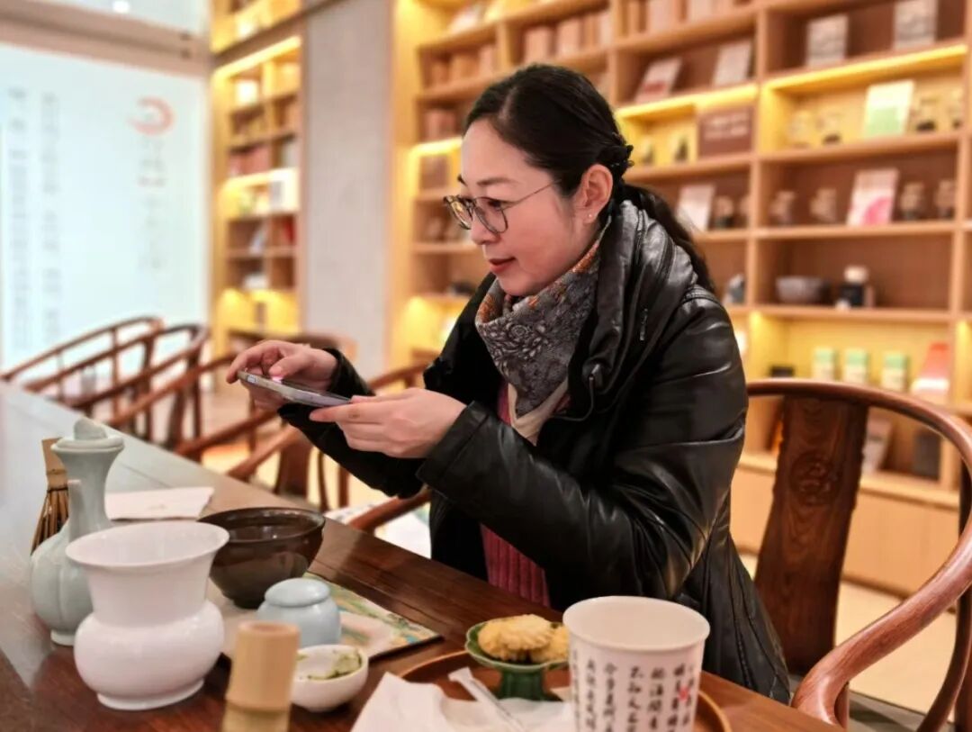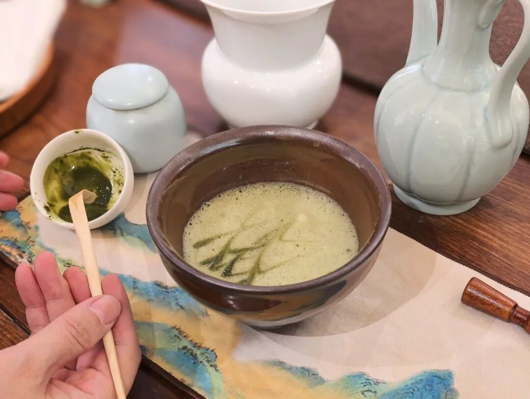 老师带领参与者沉浸式体验宋代点茶文化,大家亲手操作调膏、击拂等步骤,在习得点茶技法的同时,也感受到宋代文人的生活雅趣。