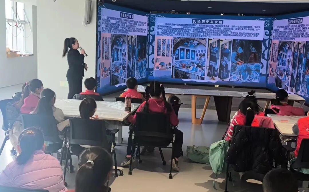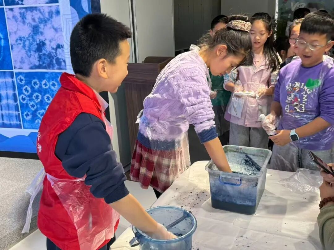 老师介绍扎染历史文化,演示折叠捆扎技法,并指导小读者们在帆布袋上体验蓝白扎染。大家在动手制作中学习传统工艺,感受其独特之美。