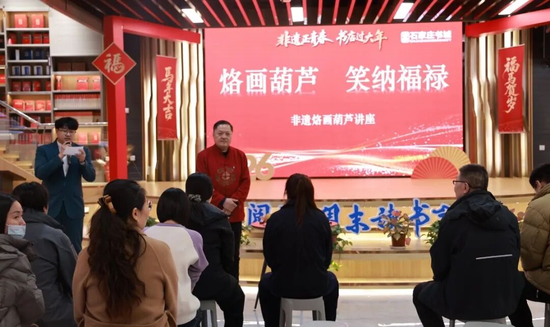 石家庄书城非遗市集首日启幕,“烙画葫芦,笑纳福禄”主题非遗讲座顺利开展。市级非物质文化遗产代表性传承人刘春普亲临授课,详解葫芦选材、烙笔技法,引导读者沉浸式体验烙画之趣,传承非遗匠心。