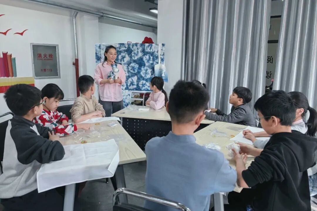 蓝印花技艺体验课温情开展,非物质文化遗产代表性传承人陈新会讲解技艺渊源,指导小朋友体验扎染工序,纯天然的蓝白花纹,藏着古人的生活智慧与匠心。